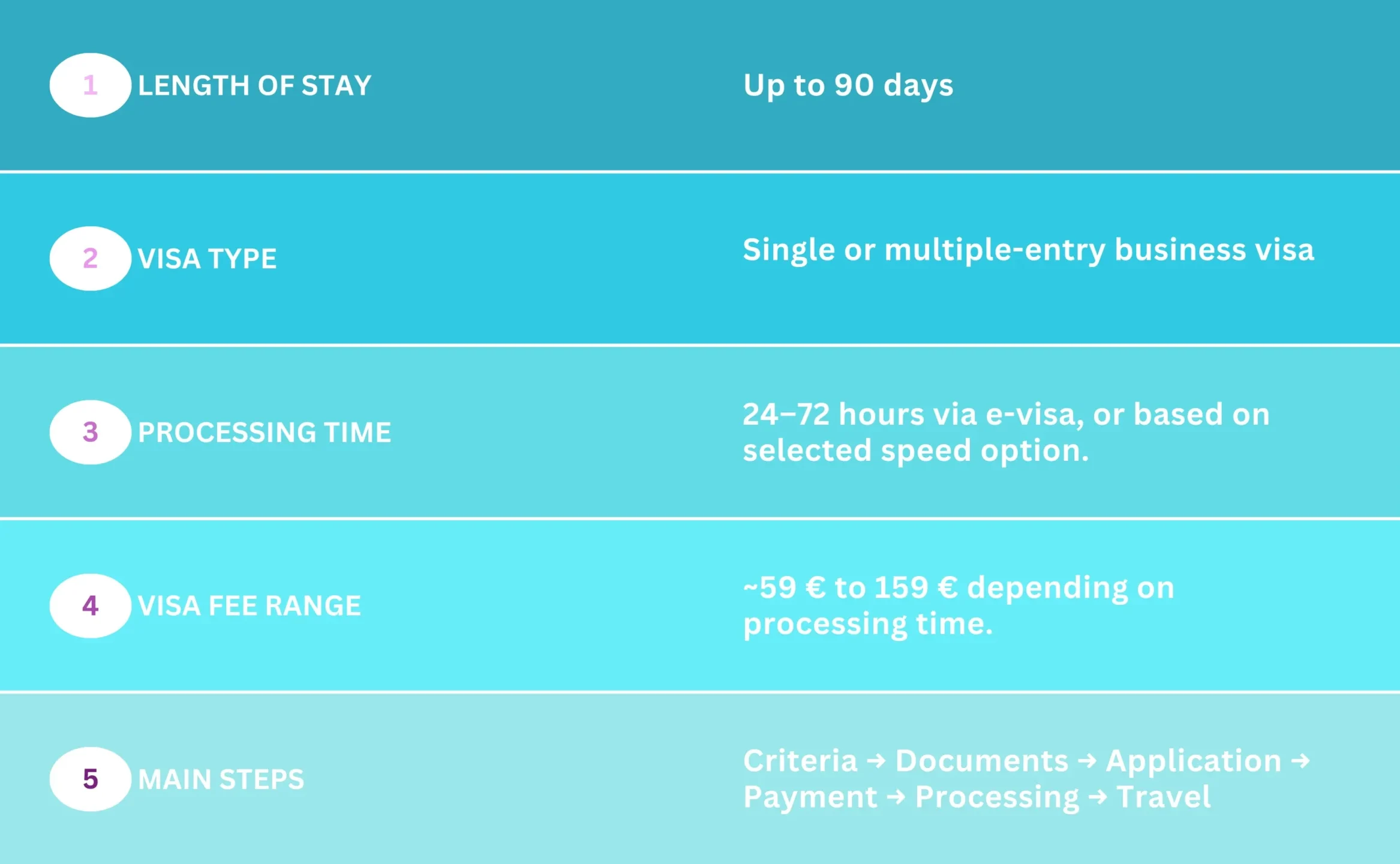 Ensure you meet essential requirements: proof of business ownership, a clear purpose of visit (e.g. attending conferences or trade fairs), confirmation of financial capacity, a clean criminal record, and good health status.