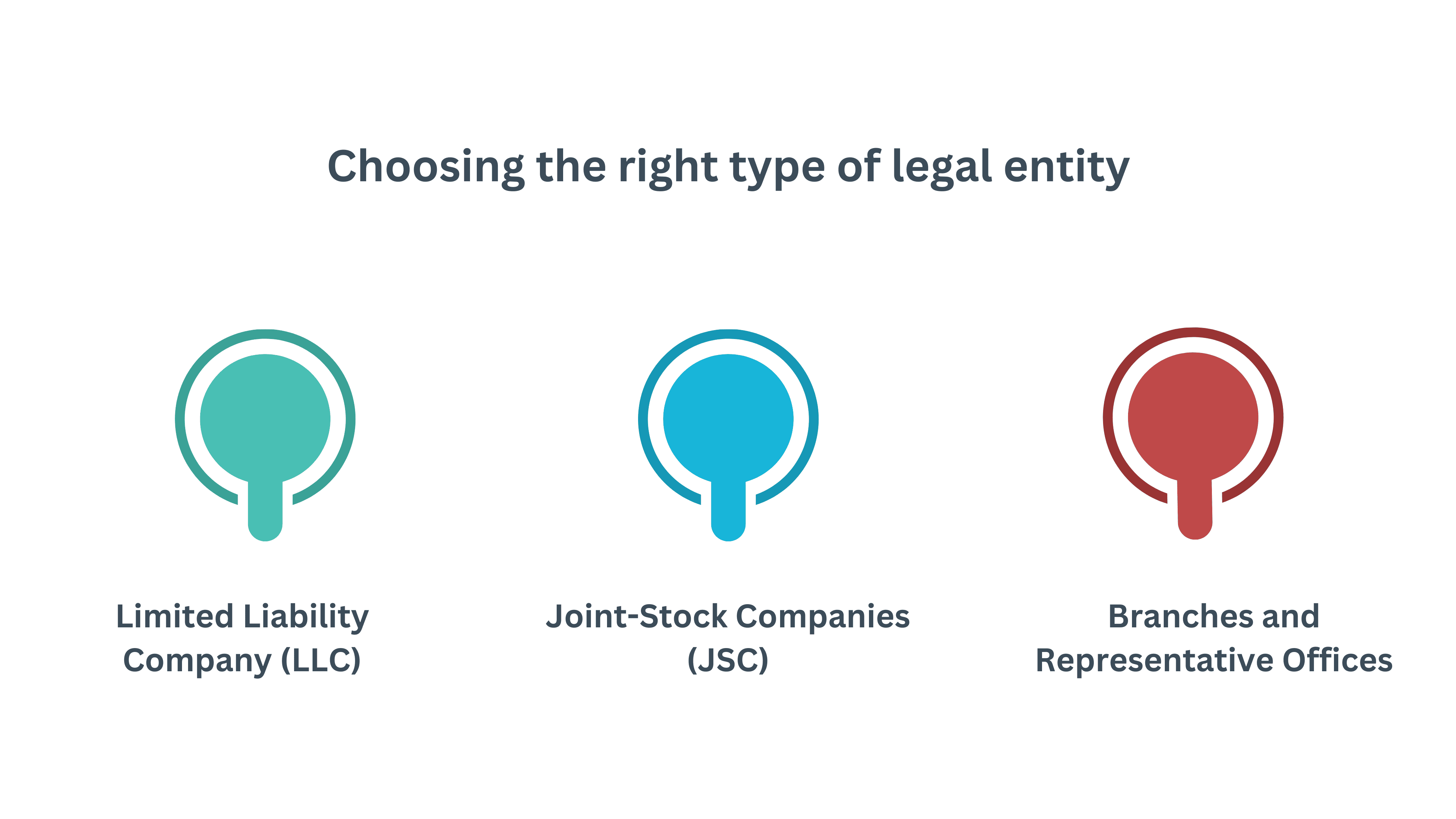 1) Choose the appropriate legal form (LLC, JSC, etc.)
