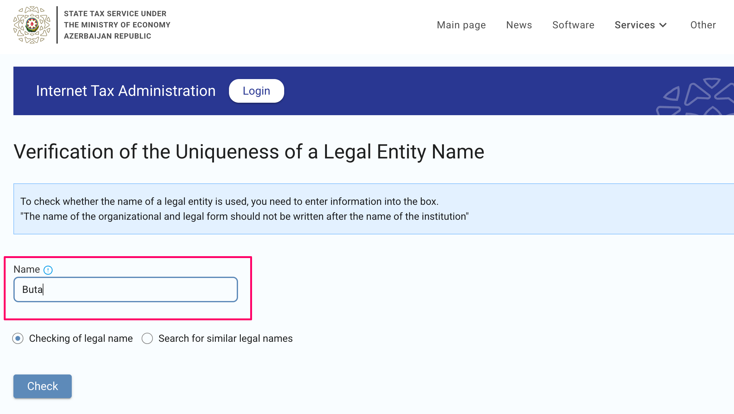 The State Tax Service under the Ministry of Economy of the Republic of Azerbaijan offers an official company name verification tool through the Internet Tax Administration portal (https://new.e-taxes.gov.az/etaxes/verification-legal-name). This online service allows users to check whether a specific business name is already registered.