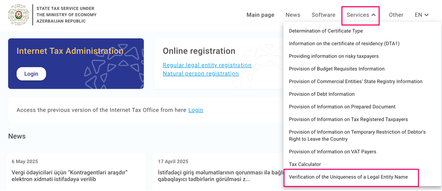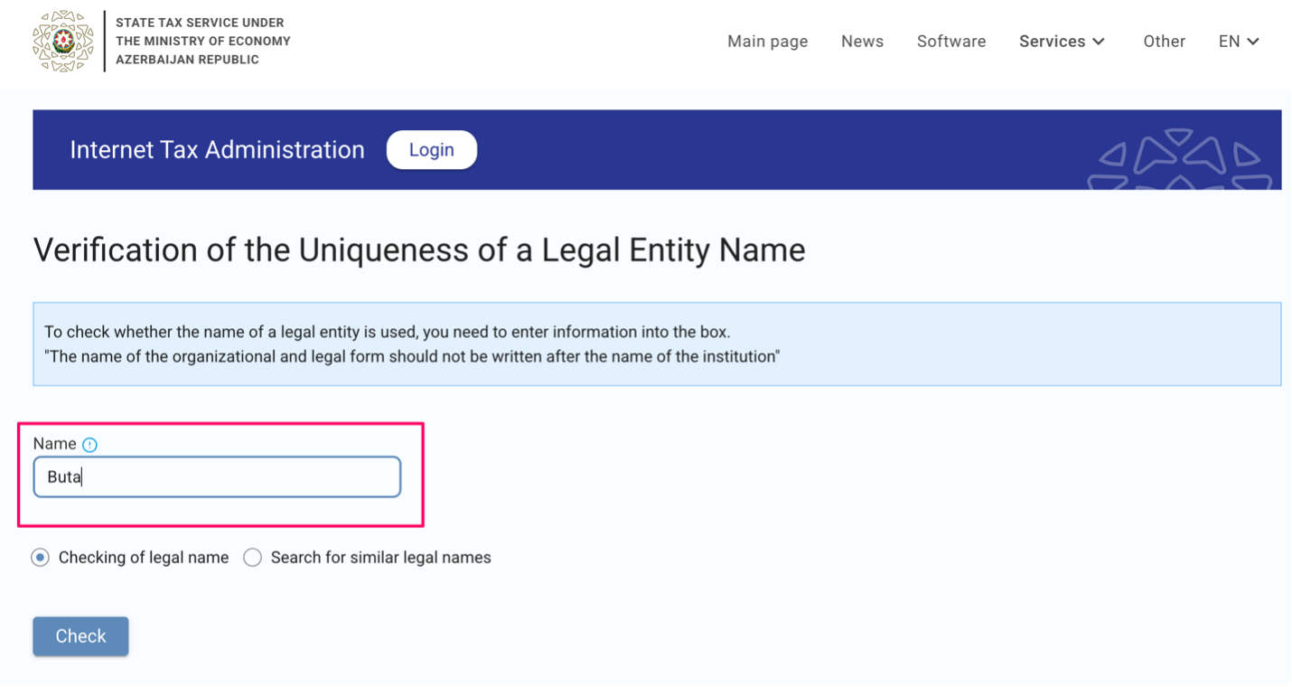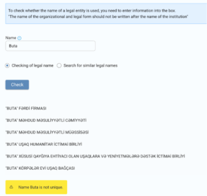 Azerbaycan Cumhuriyeti Ekonomi Bakanlığı’na bağlı Devlet Vergi Hizmeti, İnternet Vergi portal (https://new.e-taxes.gov.az/etaxes/verification-legal-name) üzerinden şirket adı doğrulama aracı sunmaktadır: